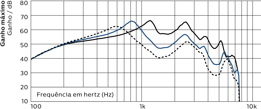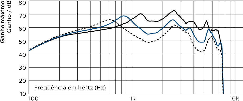 O ganho máximo é medido com o controlo do ganho do aparelho auditivo configurado na posição máxima, menos 20 dB e com uma entrada SPL de 70 dB.